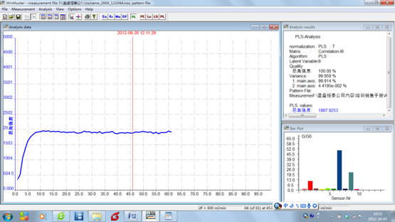 Product Category建模:对所要监控的工业园区各个化工厂所生产恶臭气体进行PEN3.5数据局采集,同时利用三点嗅袋标准方法人工进行恶臭强度标准数据的确认,将人工确认的恶臭标准数据在PEN3系统中建立PLS恶臭强度分析曲线模型,同时利用每个工厂的特殊恶臭指纹气体建立PCA/LDA工厂恶臭气体分类识别模型。